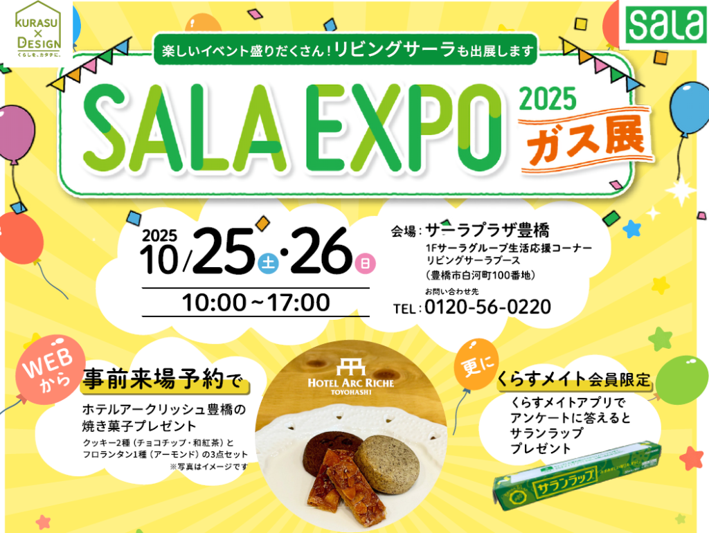 SALA EXPO 2025【豊橋】の開催日は10月25日(土) – 26日(日)の二日間。 リビングサーラも当日は出店いたします。 ささやかながら、プレゼントをご用意しましたので事前予約のうえご来場ください。