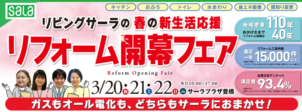 3/20(祝)・21(土)・22(日)に、サーラプラザ豊橋にてリフォーム開幕フェアを開催いたします。