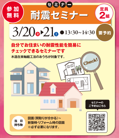 耐震セミナー 自分でお住まいの耐震性能を簡易にチェックできるセミナーです。 木造在来軸組工法のおうちが対象です。 当日の持ち物:図面(間取りが分かる) 新築時・リフォーム時の図面 ※必ず必要になります。 ※下記フォームよりご予約ください