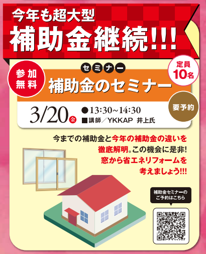 補助金のセミナー 今までの補助金と今年の補助金の違いを徹底解明。 この機会に是非!窓から省エネリフォームを考えましょう‼ ※下記フォームよりご予約ください