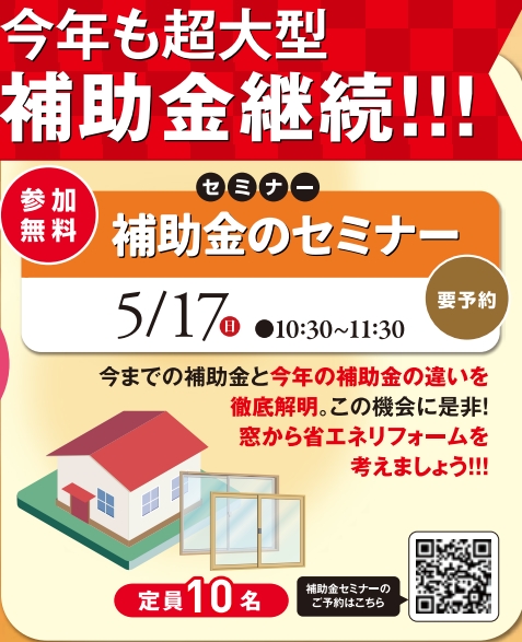 今年も超大型補助金継続‼ 補助金のセミナー 今までの補助金と今年の補助金の違いを徹底解明。 この機会に是非!窓から省エネリフォームを考えましょう‼