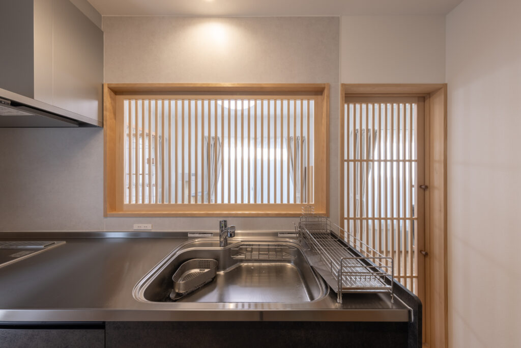 今回のリノベーションでは、お施主様のご要望を叶えるだけでなく、ご家族と愛猫の双方にとって、より安全で快適な暮らしを実現するための綿密なプランニングを行いました。最も工夫を凝らしたのは、キッチンへの愛猫の侵入を防ぐための造作建具です。愛猫が万が一かじってしまっても健康に影響がないよう、素材は無垢材を選定しました。自然素材ならではの温かみと安全性にこだわり、猫にも人にも優しい空間づくりを目指しました。また、誤って猫がキッチンに入り込んでしまわないよう、両側から施錠できる仕様としました。キッチンにあたっては、お施主様のライフスタイルを考慮し、既存の冷蔵庫とは別に冷凍庫を置けるスペースを確保するプランとし、日常のお手入れがしやすいよう、汚れに強く耐久性のある素材を選定しました。内窓設置や玄関ドアの取替によって、断熱性・防音性を向上させ、一年を通して快適な室温を保てるよう配慮しました。