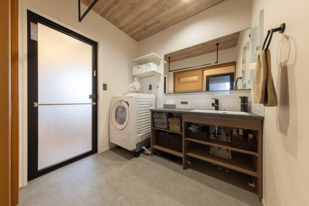 収納は、キッチン横のパントリーで抜群の収納力を確保。洗面化粧台はセミオーダーのカウンタータイプとし、ハンギングバーで機能性も追求しました。トイレも独立手洗いと造作棚で使いやすさとデザイン性を両立しました。