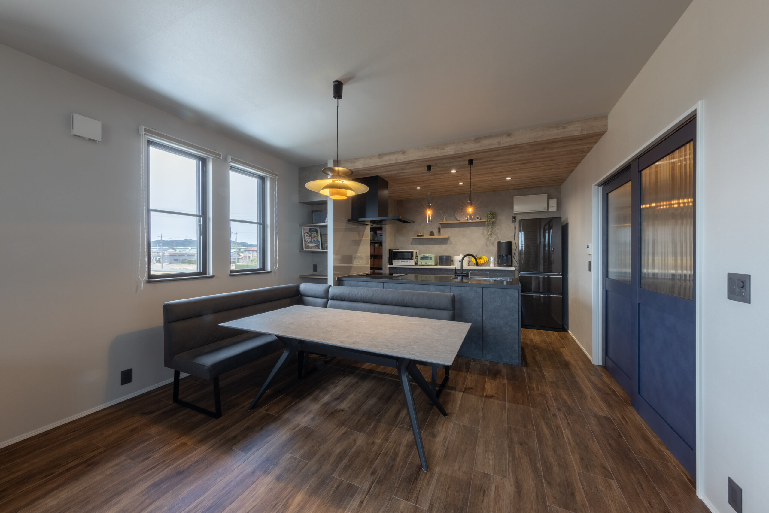 リビングのドアの色やキッチンの木目の天井がアクセントに