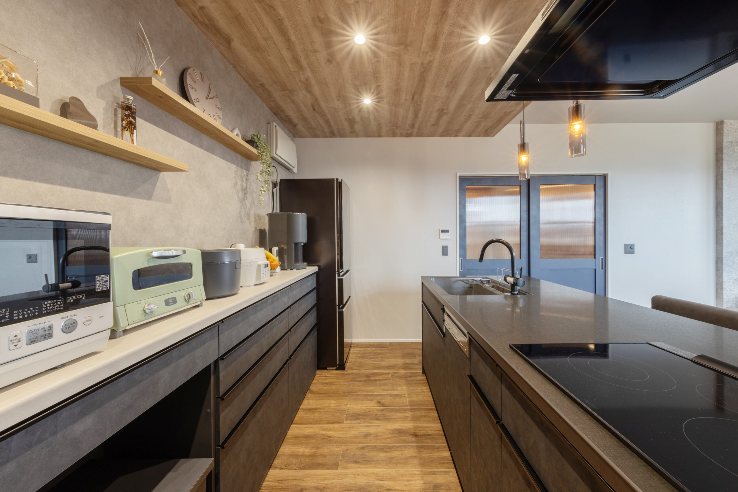 飾り棚やグレーのアクセントクロスなど、奥様こだわりのキッチン