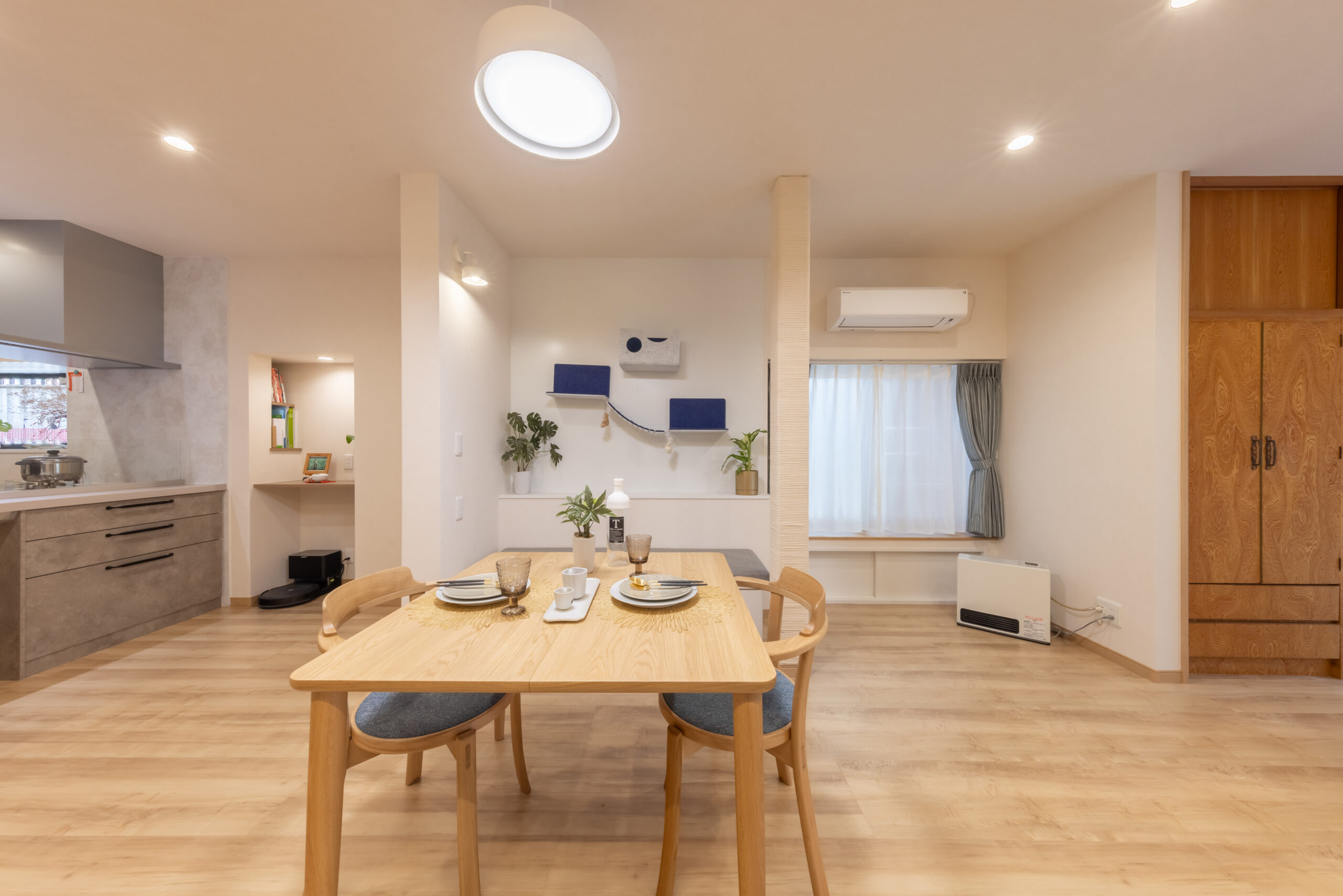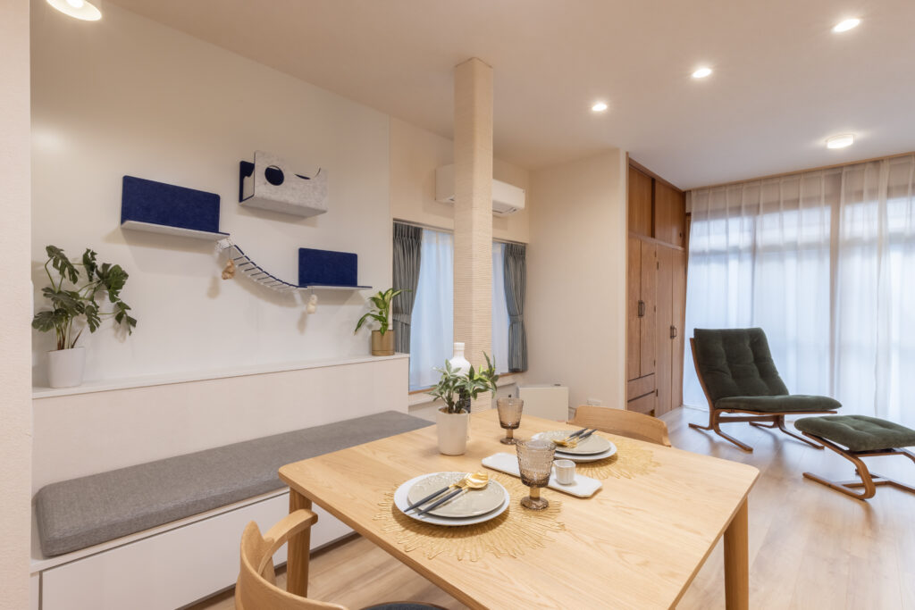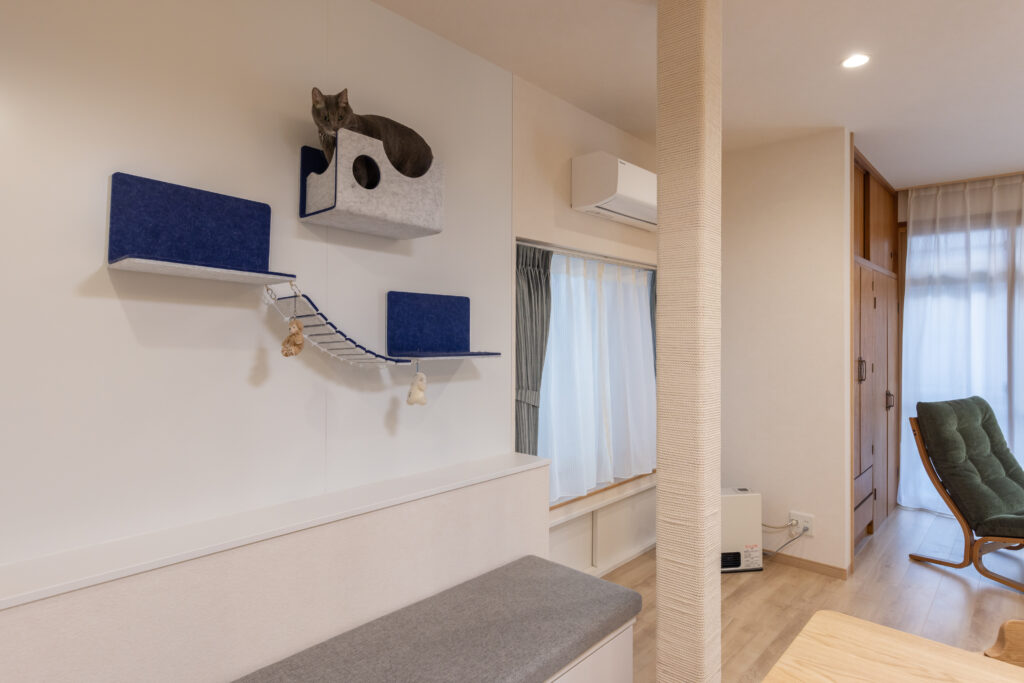 ベンチ上の壁はマグネット壁(猫壁)を採用し、猫ちゃんの居場所に。