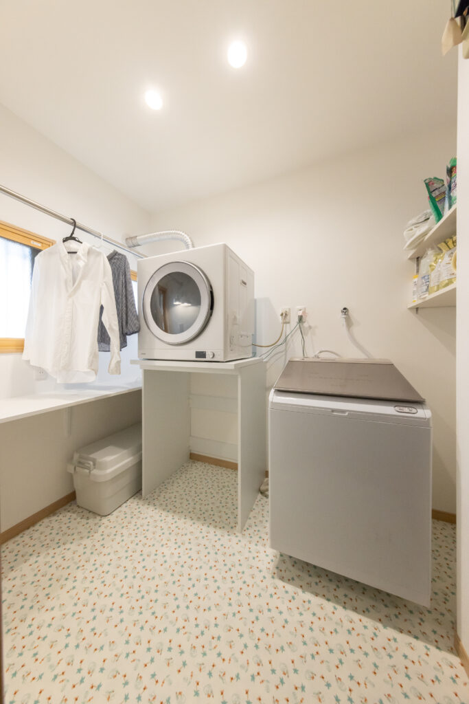 乾太くんの導入、物干しスペース&アイロン掛けカウンターを設置し、洗濯負担が大幅に軽減しました。